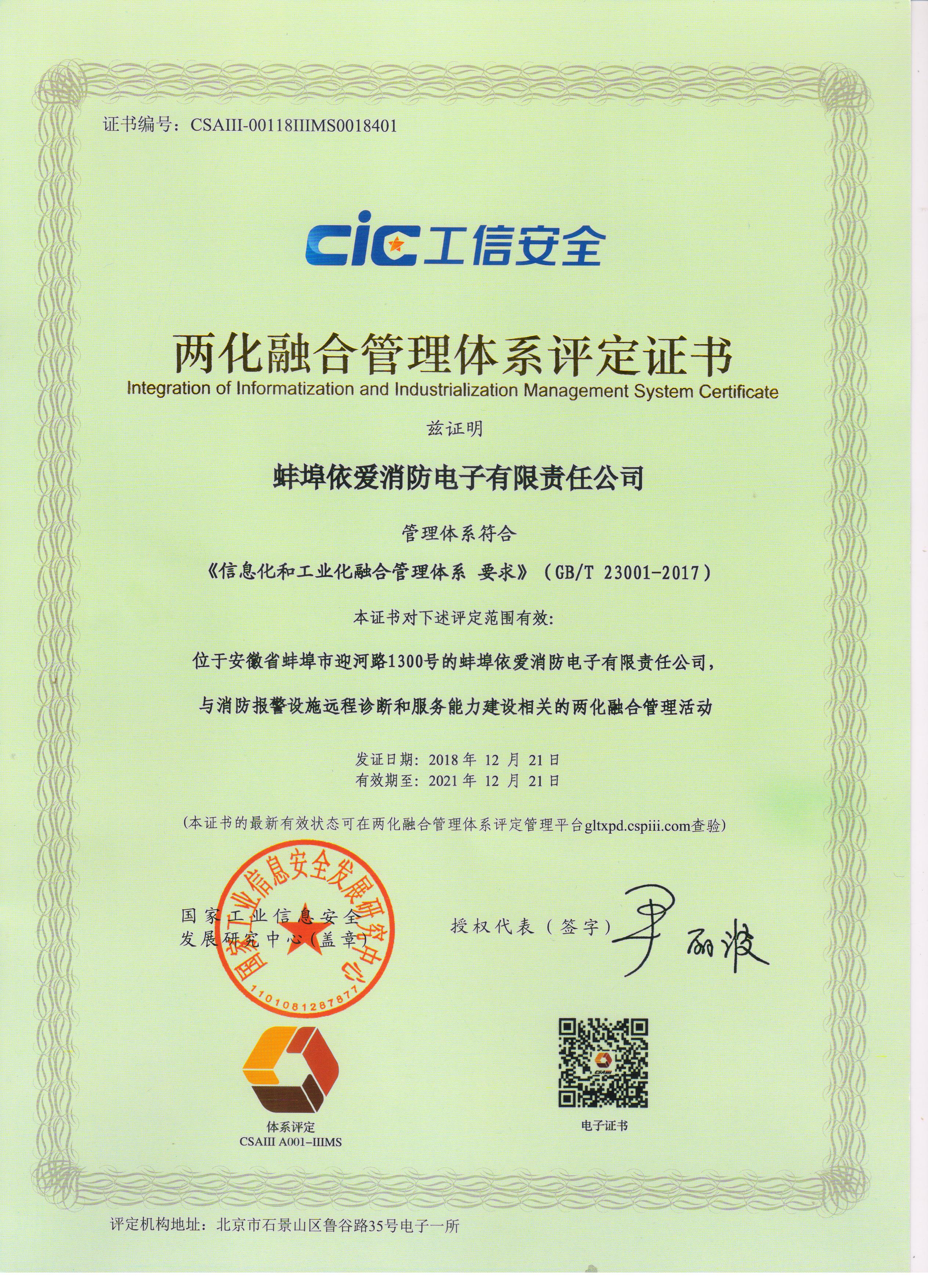 依愛(ài)消防兩化融合項(xiàng)目歷時(shí)一年,在公司管理層的指導(dǎo)及各業(yè)務(wù)部門的大力配合下,最終于2018年12月21日成功通過(guò)國(guó)家工信部審核并獲頒證書。