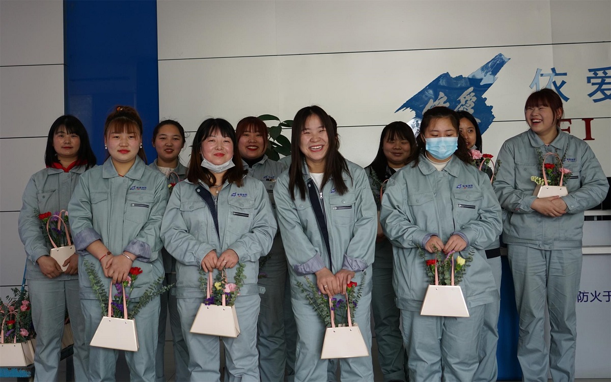 活動當天上午,各部門女員工代表前往A12廠房一樓大廳,領取了婦女節(jié)的慰問品和鮮花。并合影留念。