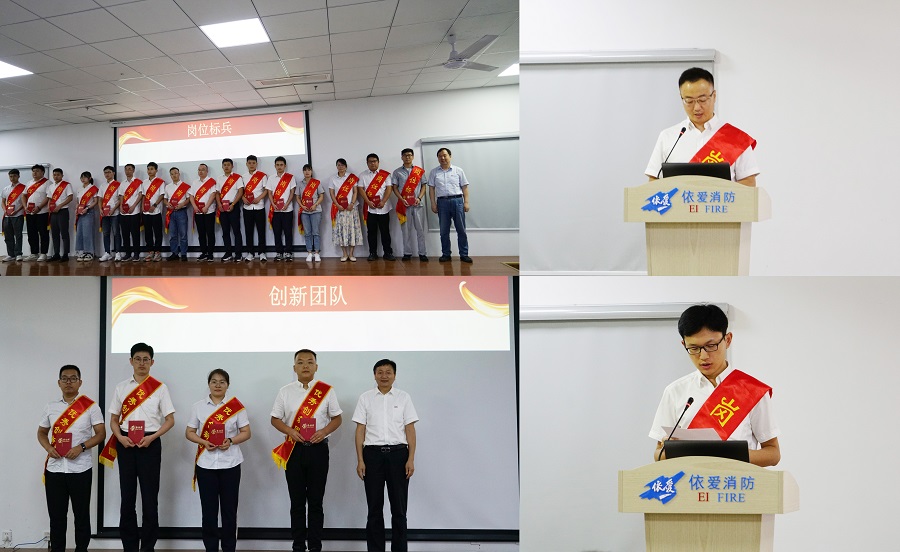 會議伊始,依愛消防黨總支黃薛梅書記宣讀公司2023年上半年創(chuàng)新團隊及崗位標(biāo)兵稱號授予決定,史紅旗董事長為崗位標(biāo)兵頒發(fā)榮譽證書并合影留念,許建華所長為創(chuàng)新團隊頒發(fā)榮譽證書并合影留念。崗位標(biāo)兵代表李澤旺、胡明宇做交流發(fā)言。
