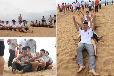 通過前面三個緊張的比賽之后,決出了四個隊伍進行終極項目—沙灘足球比賽。比賽中我們?nèi)w成員手拉手圍出了一個足球場,大家既是邊界,又是觀眾,參與感非常強。每一次斷球,都有搶奪競爭對手客戶時的喜悅;每一次傳球,都是團隊隊員相互之間的信任;每一次帶球奔馳,都像手握項目漏斗有底氣;最后的臨門一腳,像揮灑汗水拿到了訂單,充滿了愉悅??粗蠹以诮鹕成吓ζ床臉幼?,我們激情高漲,抬頭看了看海的遠(yuǎn)方,心中充滿了愛與喜悅。